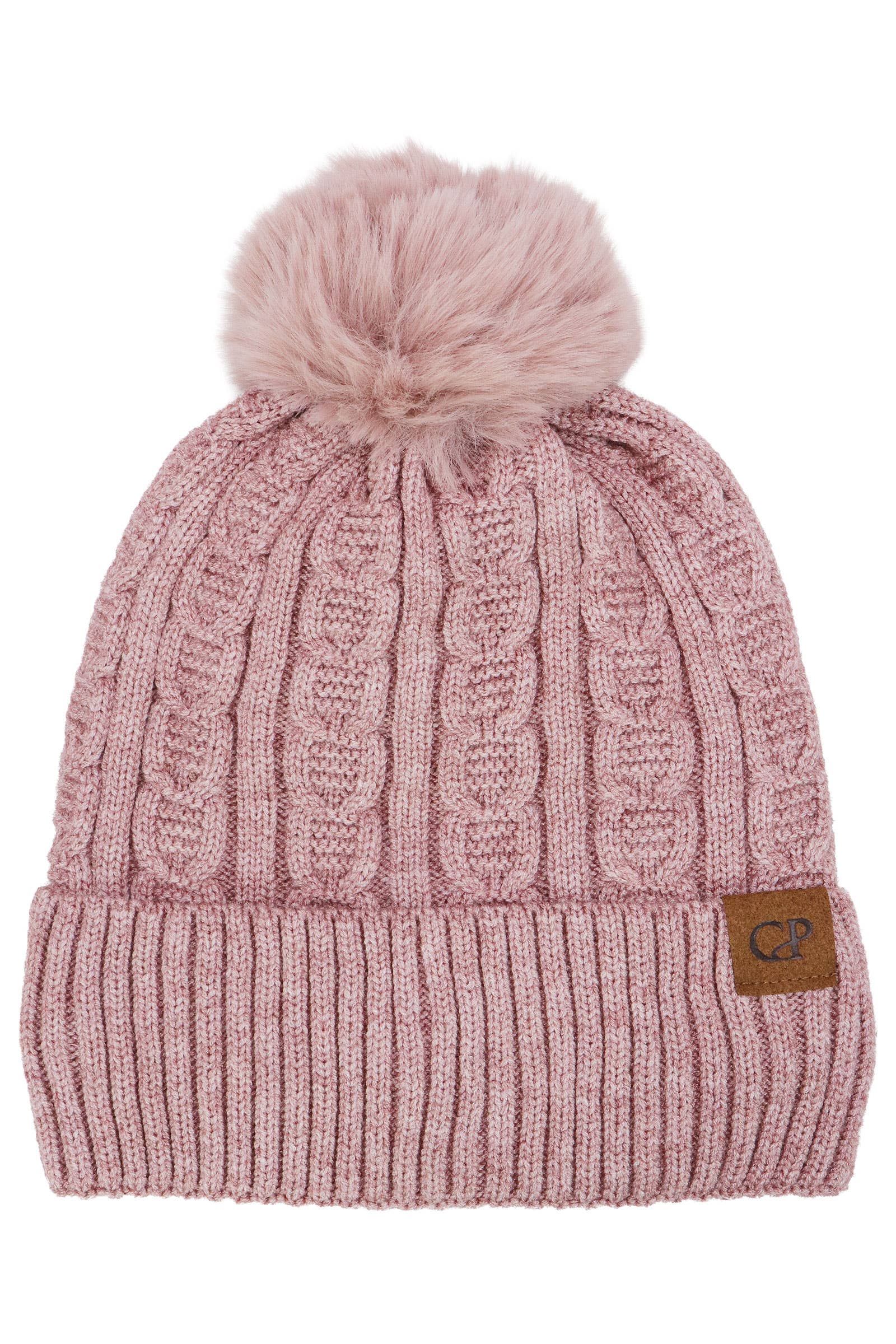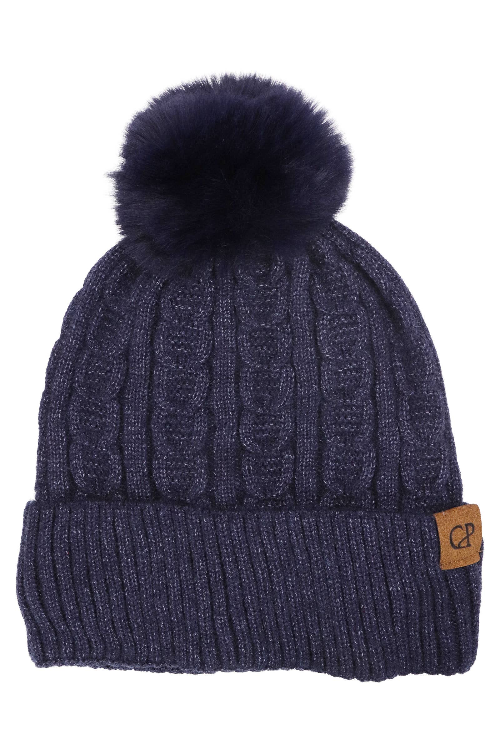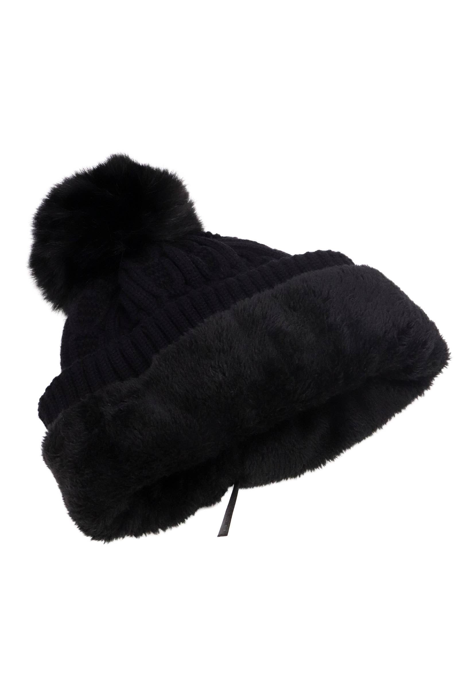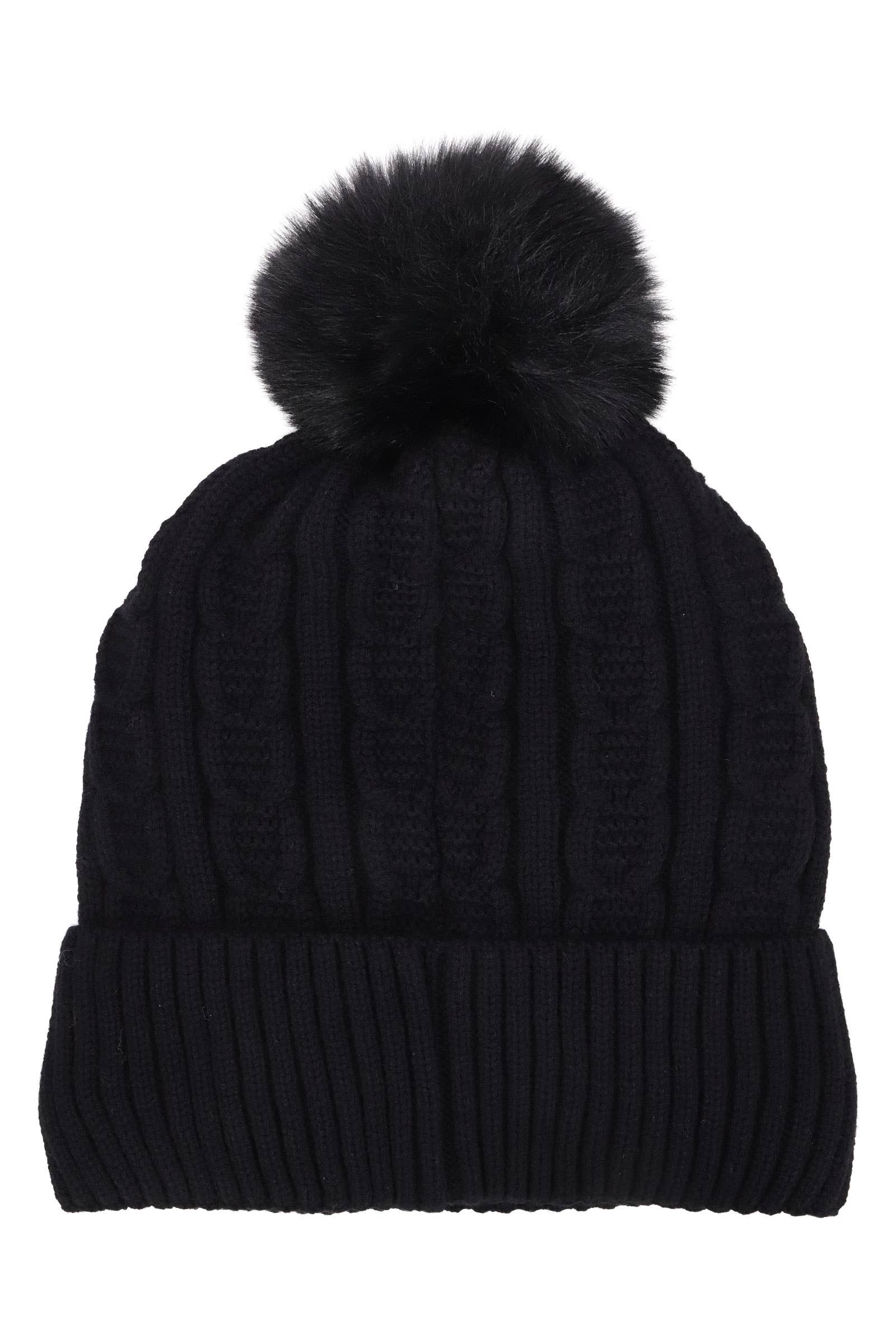 Stay warm and stylish with this cable knit beanie, topped with a soft faux fur pom for a playful touch. Fully lined with plush faux fur, it offers extra warmth and comfort on chilly days.