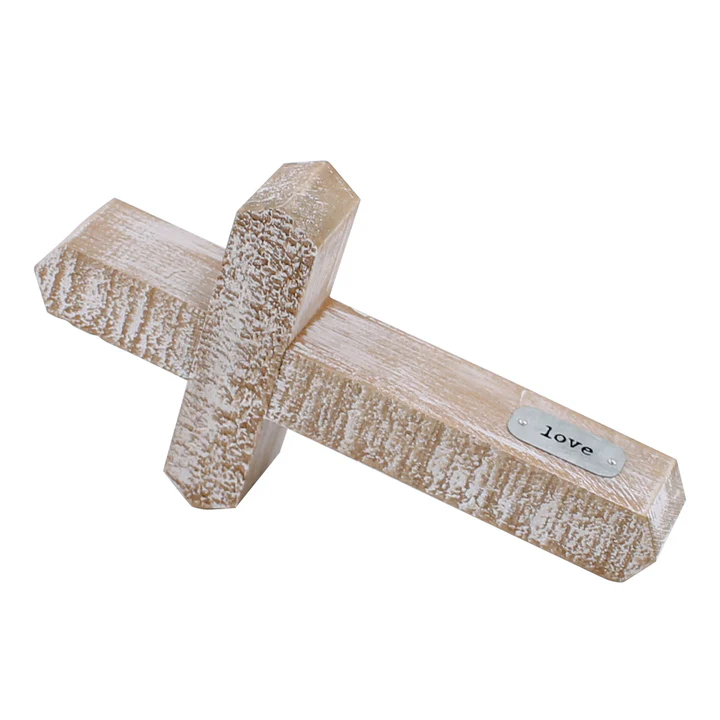 | FEATURES | White Weathered Wood Cross Sitter with Metal Emblem and Black Text. |